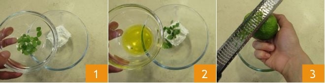 Pour réaliser les figues farcies, commencez par laver et sécher délicatement les figues. Dans un bol, mélangez la robiola avec les feuilles de mélisse 1, les 10 g d'huile d'olive 2, le zeste de citron vert 3, du sel et du poivre