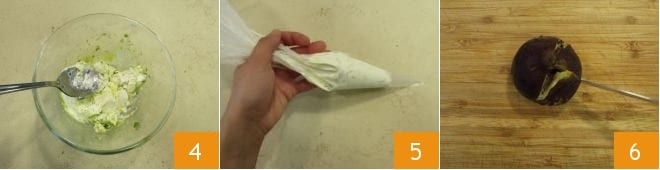 et travaillez le tout avec une cuillère 4 jusqu'à obtenir une crème lisse. Transférez la crème dans une poche à douille 5. Maintenant, incisez une croix avec le couteau sur le dessus des figues pour les diviser en quatre parties 6
