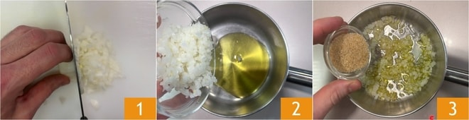 Pour préparer le filet de boeuf avec sauce au vin rouge, commencez par la sauce : épluchez l'oignon et hachez-le finement 1. Dans une petite casserole, chauffez un filet d'huile, ajoutez l'oignon haché 2 et faites-le revenir à feu moyen pendant quelques minutes, puis ajoutez le sucre brun 3.