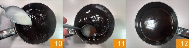 Versez le mélange obtenu dans la sauce hors du feu 10, mélangez bien 11 et enfin rectifiez l'assaisonnement en sel. Vérifiez que la sauce au vin rouge nappe le dos de la cuillère, c'est la consistance correcte. Gardez de côté au chaud 12.