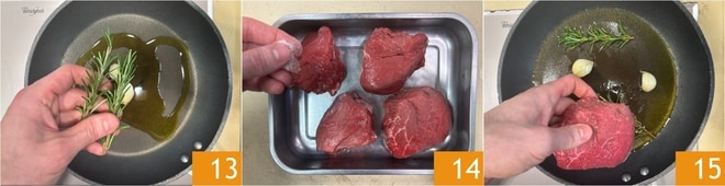 Passez à la cuisson des filets de boeuf : dans une grande poêle, faites revenir l'huile avec les gousses d'ail et les brins de romarin 13. Pendant ce temps, salez la viande en surface 14. Quand l'huile sera bien chaude, déposez les filets dans la poêle 15.