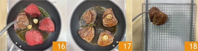 Saisissez à feu moyen-élevé pendant 3 minutes de chaque côté ; de cette façon, vous obtiendrez une cuisson saignante 16. Pour une cuisson à point, comptez 8 minutes de chaque côté, tandis que si vous préférez la viande bien cuite, comptez environ 10 minutes de chaque côté. Quand les filets seront prêts 17, transférez-les sur une grille en veillant à ne pas percer la viande 18 et laissez-les reposer pendant quelques minutes, ainsi les jus se redistribueront.