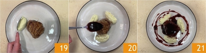 Servez les filets avec un accompagnement de purée de pommes de terre, par exemple 19, et arrosez le plat avec la sauce au vin rouge 20. Votre filet de boeuf avec sauce au vin rouge est prêt à être dégusté 21 !