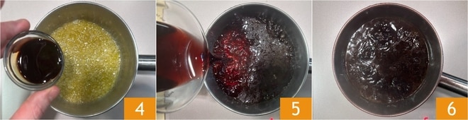 Ajoutez aussi le vinaigre balsamique 4 et laissez caraméliser pendant une autre minute, puis ajoutez le vin rouge 5 et portez à ébullition. Laissez réduire la sauce pendant environ 10-15 minutes 6.