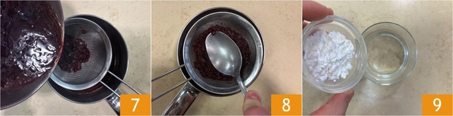 Quand la sauce aura réduit de moitié, filtrez-la à travers une passoire 7 et pressez l'oignon avec le dos d'une cuillère pour en extraire tout le jus 8. Dans un petit bol à part, diluez la fécule de maïs dans un peu d'eau 9.