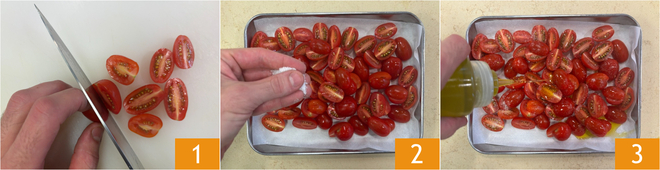 Pour préparer le filet de cabillaud à la vapeur avec tomates et câpres, commencez par diviser les tomates cerise en 4 parts 1, puis répartissez-les sur une plaque recouverte de papier sulfurisé. Assaisonnez avec du sel 2 et de l'huile 3, et faites cuire dans un four ventilé préchauffé à 180° pendant 40 minutes.