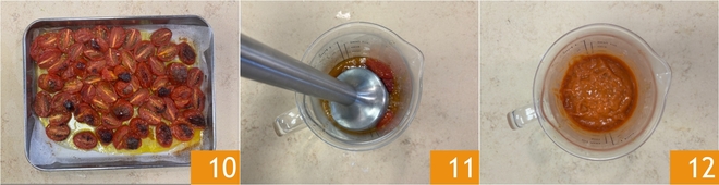 Lorsque les tomates sont cuites 10, transférez-en la moitié dans un récipient et mixez avec un mixeur plongeant 11 pour obtenir une crème lisse et homogène 12.