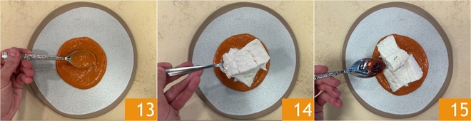 Vous êtes prêt à dresser : étalez la crème de tomates rôties au fond de l'assiette 13, puis déposez dessus 2 morceaux de cabillaud 14 et garnissez avec les tomates cerise entières mises de côté 15.