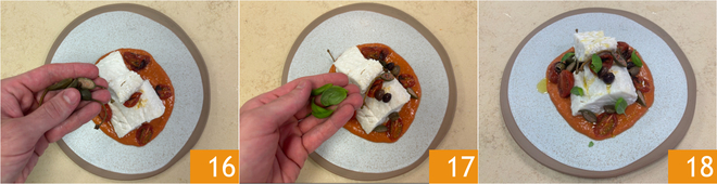 Enfin, ajoutez les cucunci 16, les olives taggiasca, quelques feuilles de basilic 17 et un filet d'huile. Votre filet de cabillaud à la vapeur avec tomates et câpres est prêt à être servi 18 !