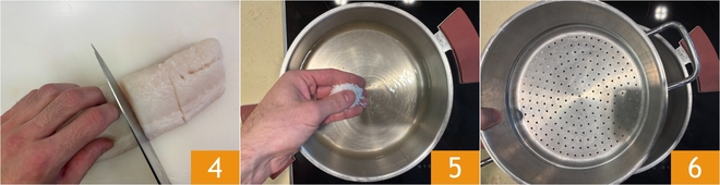 Entre-temps, coupez le filet de cabillaud en portions de 100 g chacune 4. Salez l'eau dans le cuiseur vapeur 5, placez le panier dessus 6 et portez à ébullition.