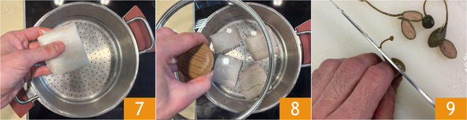 Déposez les morceaux de cabillaud dans le panier 7, couvrez avec le couvercle 8 et faites cuire pendant 7 minutes. Une fois ce temps écoulé, retirez le cabillaud du cuiseur vapeur et tamponnez-le délicatement avec du papier absorbant pour éliminer l'excès d'eau. Entre-temps, divisez les cucunci en deux 9.