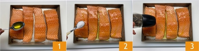Pour préparer le filet de saumon à la poêle, commencez par la marinade : placez les filets dans un saladier et assaisonnez-les avec de l'huile 1, du sel 2 et du poivre noir fraîchement moulu 3.