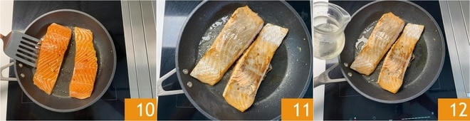 Cuisez le saumon pendant 4 minutes d'un côté, puis retournez-le délicatement 10. Cuisez encore pendant une minute 11 et déglacez avec le vin blanc 12.