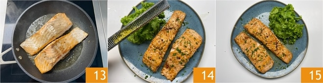 Laissez évaporer l'alcool et cuisez encore pendant 3 minutes 13. Transférez le saumon dans une assiette, garnissez de persil haché et de zeste de citron râpé 14. Votre filet de saumon à la poêle est prêt à être servi 15 !