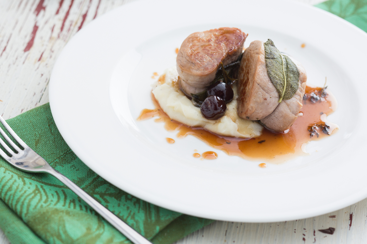 Filet mignon de porc aux griottes avec purée de pommes de terre