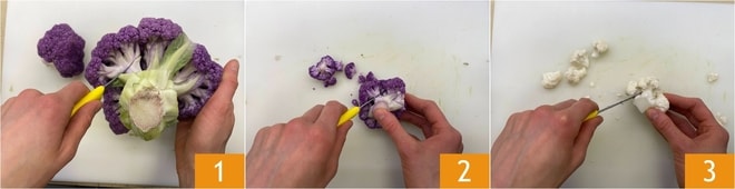 Pour préparer les filets de bar au four, commencez par laver les légumes. Commencez ensuite par le chou-fleur violet, séparez les fleurons 1 et divisez-les en plus petits morceaux 2. Faites de même pour le chou-fleur blanc 3.