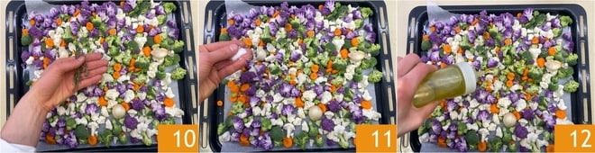 Ajoutez le thym citron 10, le sel 11, le poivre et un filet d'huile 12. Massez les légumes pour uniformiser l'assaisonnement et faites cuire au four statique préchauffé à 180°C pendant 20 minutes.