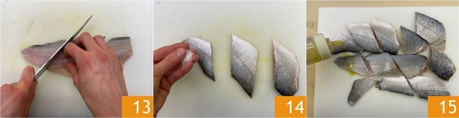Pendant ce temps, passez aux filets de bar. Assurez-vous qu'il n'y a pas d'arêtes, sinon retirez-les avec une pince. Ensuite, coupez chaque filet en 3 morceaux en réalisant une coupe oblique 13. Salez le bar 14 et assaisonnez-le avec de l'huile 15. Massez pour uniformiser l'assaisonnement.