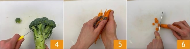 Prélevez ensuite les fleurons du brocoli 4. Passez aux carottes, épluchez-les 5 et coupez-les en rondelles 6.