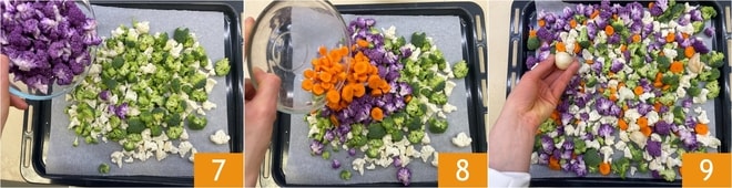 Dans un plat recouvert de papier sulfurisé, versez les brocolis et les choux-fleurs 7; ajoutez aussi les carottes 8 et les 3 gousses d'ail en chemise 9.