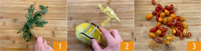 Pour préparer les filets de dorade à la poêle, hachez le persil 1 en prenant soin de garder les tiges, pelez le citron pour en extraire le zeste 2, enfin lavez et coupez en deux les tomates cerises 3.