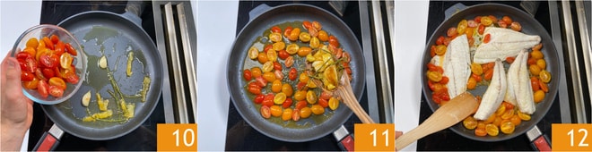 Dans le fond de cuisson, vous pouvez ajouter les tomates cerises 10. Faites-les grésiller pendant environ 10 minutes, ou jusqu'à ce que la chair soit ramollie. Ensuite, retirez les zestes, l'ail et les tiges de persil 11. Ajustez le sel, ajoutez les filets de dorade et laissez cuire encore 2 minutes, le temps de faire prendre la saveur 12.