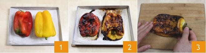Pour préparer les filets de poivrons rôtis avec anchois aux saveurs, commencez par faire chauffer le four à la température maximale. Ensuite, lavez soigneusement les poivrons sous l'eau courante et séchez-les avec un torchon ou du papier essuie-tout. Placez-les sur une plaque recouverte de papier cuisson 1 et faites-les cuire au four statique à 180° pendant 30-40 minutes. Le temps de cuisson dépend du type de poivron, de la taille et de l'épaisseur de la chair. Lorsque la surface sera ridée et grillée 2, vous pouvez les sortir du four. Ensuite, transférez-les sur une planche à découper et retirez le pédoncule 3.
