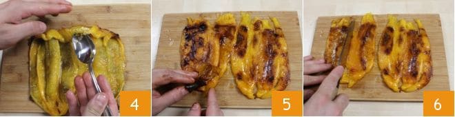 Ouvrez-les délicatement, en faisant attention à ne pas briser la chair et éliminez les graines à l'intérieur à l'aide d'une cuillère 4. Ensuite, retirez la peau avec les mains ou à l'aide d'un petit couteau 5. Si vous avez du mal à réaliser cette opération, mettez les poivrons encore chauds dans un sac en plastique (ceux pour congeler les plats) et attendez 10-15 minutes. Passé ce temps, vous devriez réussir à enlever la peau plus facilement. Enfin, coupez-les en filets dans le sens de la longueur 6. Réalisez les mêmes opérations avec le poivron rouge et mettez tout de côté.
