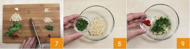 Maintenant, occupez-vous de l'assaisonnement : hachez la gousse d'ail, les pignons de pin, le persil et le piment frais rouge 7. Versez l'ail et les pignons de pin hachés dans un bol et ajoutez également le persil et le piment (8-9).