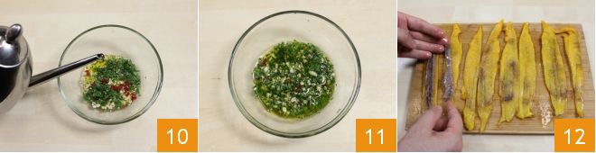 Enfin, assaisonnez avec un filet d'huile 10, jusqu'à ce que toutes les saveurs soient bien imprégnées 11. À ce stade, prenez les filets de poivrons et étalez une anchois sur chacun d'eux 12.