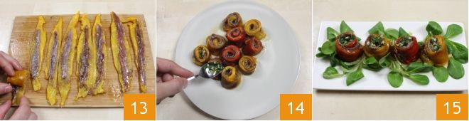Roulez chaque filet en formant de petits roulés 13, transférez-les sur une assiette et assaisonnez-les avec l'assaisonnement d'arômes que vous avez préparé 14. Il ne vous reste plus qu'à disposer vos roulés de poivrons rôtis avec anchois aux saveurs sur un lit de salade et à les servir 15 !