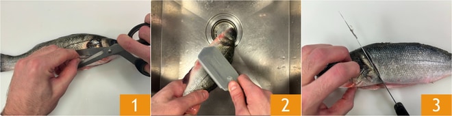 Pour préparer le filet de bar avec fenouils caramélisés et sauce à l'orange, commencez par vous occuper du nettoyage du bar. Faites une incision sur le ventre, jusqu'à sous la tête, retirez les viscères et rincez sous l'eau courante pour éliminer toutes les impuretés. Coupez les nageoires ventrales 1. Écailler avec l'outil approprié, ou avec le dos d'un couteau, sous l'eau courante 2. Faites une incision oblique 3, juste après les branchies, en partant du dos et en rejoignant l'incision faite sur le ventre.