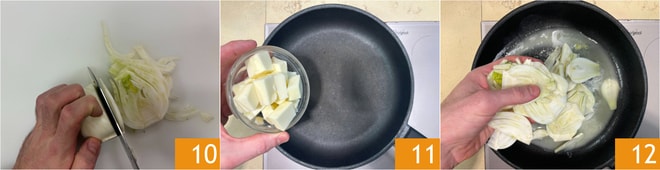 Nettoyez les fenouils, en enlevant le plumet et la base la plus dure, puis coupez-les en tranches 10. Dans une poêle, faites fondre le beurre 11, puis ajoutez les fenouils 12 et faites cuire pendant 5 minutes, en remuant de temps en temps, jusqu'à ce qu'ils commencent à dorer.
