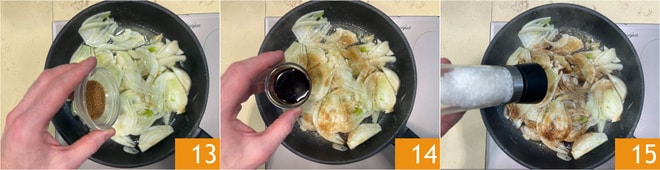 Ajoutez le sucre de canne 13, mélangez et faites cuire encore 5-7 minutes, les fenouils doivent être caramélisés et tendres. Versez le vinaigre balsamique dans la poêle 14, assaisonnez avec du sel et du poivre 15. Mélangez une dernière fois pour amalgamer les assaisonnements, puis retirez du feu, couvrez avec un couvercle et gardez au chaud jusqu'au moment du dressage.