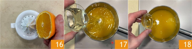 Pressez les oranges 16 et mettez le jus dans une petite casserole. Ajoutez le vin blanc 17, le miel 18 et portez à ébullition.
