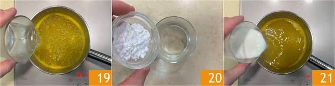 Versez un peu d'eau 19 et faites réduire la sauce à feu moyen pendant environ 10 minutes. Pendant ce temps, dissolvez la fécule de maïs dans un peu d'eau 20. Une fois le temps écoulé, versez la fécule de maïs dans la sauce 21, remuez continuellement jusqu'à ce qu'elle épaississe.