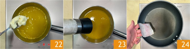Ajoutez le beurre 22, assaisonnez avec du sel et du poivre 23 et mélangez une dernière fois. Retirez du feu et gardez au chaud jusqu'au moment du dressage. Chauffez une poêle antiadhésive à feu moyen-vif, ajoutez les filets de bar côté peau vers le bas 24.
