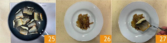 Faites cuire pendant 3-4 minutes, la peau doit être croustillante et dorée 25. Retournez les filets et faites cuire encore 2-3 minutes. Dressez en plaçant au centre de l'assiette les fenouils caramélisés 26, déposez dessus les filets de bar 27.