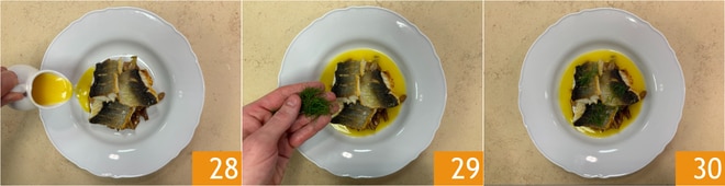Versez la sauce à l'orange sur le poisson et au fond de l'assiette 28 et complétez avec le plumet du fenouil 29. Votre bar avec fenouils caramélisés et sauce à l'orange est prêt à être dégusté 30 !
