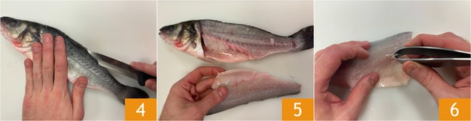 Incisez la queue et la partie dorsale du poisson en suivant la colonne vertébrale 4. De cette façon, vous aurez obtenu le premier filet 5, répétez le même procédé pour le deuxième filet. Retirez avec la pince les éventuelles arêtes 6.