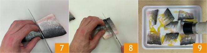 Coupez les filets en losanges d'environ 5-6 cm de longueur 7. Faites 2-3 incisions sur le côté de la peau 8. Déposez-les sur une plaque et assaisonnez avec de l'huile et du sel 9. Réservez.