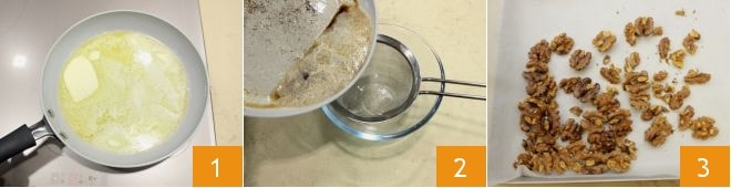 Pour préparer les financiers aux noix avec confiture de pêches, faites fondre le beurre à feu doux dans une grande poêle 1, en remuant avec une cuillère en bois jusqu'à ce qu'il devienne brun : vous obtiendrez ainsi le beurre noisette, c'est-à-dire un beurre fondu de couleur noisette doré pour acquérir un arôme très particulier. Filtrez le beurre noisette dans un petit bol à l'aide d'une passoire à mailles fines 2 et laissez tiédir. Faites griller les noix à 180° pendant 3-4 minutes sur une plaque recouverte de papier sulfurisé 3;