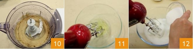 Actionnez le mixeur pour créer un mélange homogène 10 puis transférez la pâte obtenue dans un bol. Dans un récipient, séparez les jaunes des blancs d'œufs, en montant ces derniers avec la pincée de sel 11 : lorsque le mélange devient blanc et mousseux, vous pouvez ajouter le reste du sucre 12.