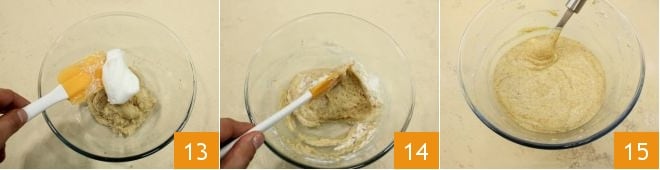 Versez une petite quantité de blancs montés en neige 13 et mélangez avec une spatule pour assouplir la pâte ; ajoutez ensuite les blancs restants en mélangeant de bas en haut pour éviter qu'ils ne se démontent 14, jusqu'à ce que le mélange soit lisse et homogène 15.