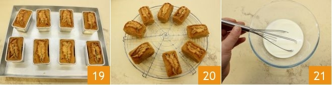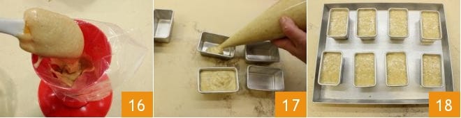 Mettez la pâte obtenue dans une poche à douille sans buse à laquelle vous pouvez faire un trou 16. Beurrez 8 moules rectangulaires de dimensions 8x5,5x4 cm et remplissez-les aux ¾ avec environ 95 g de pâte 17. Une fois terminé 18, faites cuire les financiers dans un four statique préchauffé à 170° pendant 25 minutes (ou 150° pendant 15 minutes si en four ventilé).