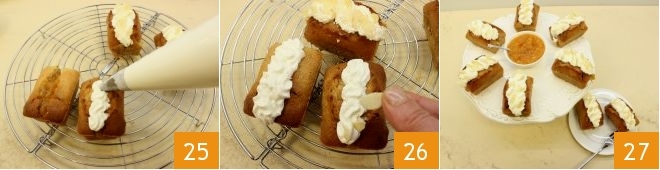 Garnissez la surface des financiers avec la crème fouettée (en recouvrant la fente pour la garniture) 25 et terminez en distribuant les amandes effilées 26 : vos financiers aux noix avec confiture de pêches sont prêts à être servis 27.