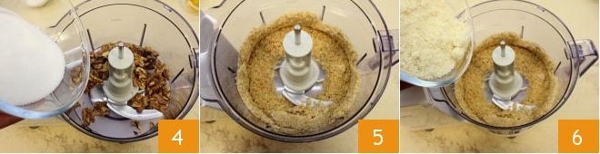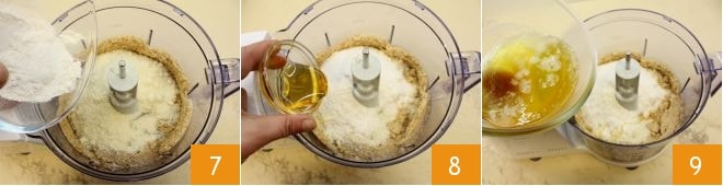 Dans un mixeur, placez les noix grillées et la moitié de la dose de sucre 4, qui servira à absorber l'huile libérée par les noix pendant le broyage. Actionnez les lames par intermittence (pour éviter que les noix ne surchauffent) afin d'obtenir une farine 5. Ajoutez dans le mixeur la farine d'amandes 6,