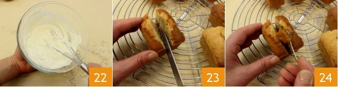 Une fois prête 22, mettez-la dans une poche à douille munie d'une buse étoilée. Après le temps nécessaire, vous pouvez garnir les financiers : faites une petite incision verticale sur le côté long sans atteindre le fond, puis ouvrez délicatement les gâteaux 23 ; avec une cuillère, garnissez l'intérieur avec la confiture de pêches 24 (vous pouvez aussi vous aider d'une poche à douille sans buse à laquelle vous pouvez faire un trou).