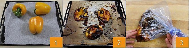 Pour préparer la fausse carbonara, commencez par prendre les poivrons jaunes et, après les avoir lavés soigneusement, mettez-les sur une plaque recouverte de papier sulfurisé 1. Enfournez les poivrons à 250 degrés dans un four statique pendant 40-45 minutes (dans un four ventilé à 230 degrés pendant environ 35 minutes) 2. Une fois cuits, mettez les poivrons dans un sac et laissez-les tiédir pendant une dizaine de minutes, cette étape facilitera le retrait de la peau et vous permettra de les peler plus facilement 3.