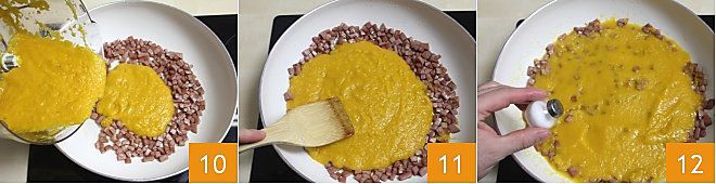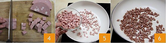 Pendant que les poivrons tiédissent, prenez la mortadelle et coupez-la en dés 4. Une fois cela fait, faites revenir les dés de mortadelle dans une grande poêle antiadhésive, sans ajouter d'huile, 5 jusqu'à ce qu'ils soient dorés 6